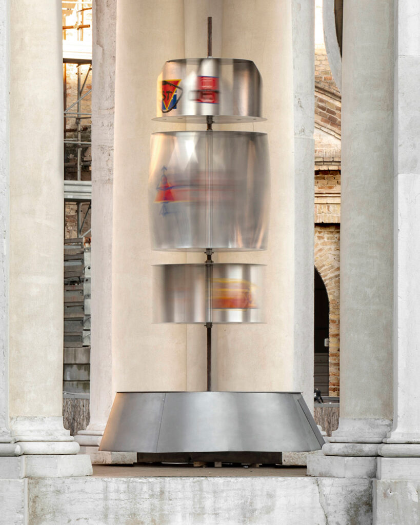 The further element of surprise is that the bell announces its presence visually and not acoustically through an unexpected interplay of light. Fiorenzi continues: “I decided to hybridise the concept of the lighthouse. A kinetic sculpture which becomes a signal installed within the sea, in mimesis with atmospheric phenomena. Moved by the wind and illuminated by the sun, the bell creates a shimmer that is in full mimesis with its surroundings. The light that it emits is emitted because the bell is chromed. The sunlight creates a reflection on the chrome blades resulting in this flicker, this shimmer on the sea”.